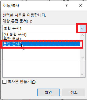 이동/복사 대화상자가 나오면 대상 통합 문서에 드롭박스를 선택한 뒤, 시트를 복사하려는 통합문서를 선택하여 줍니다.