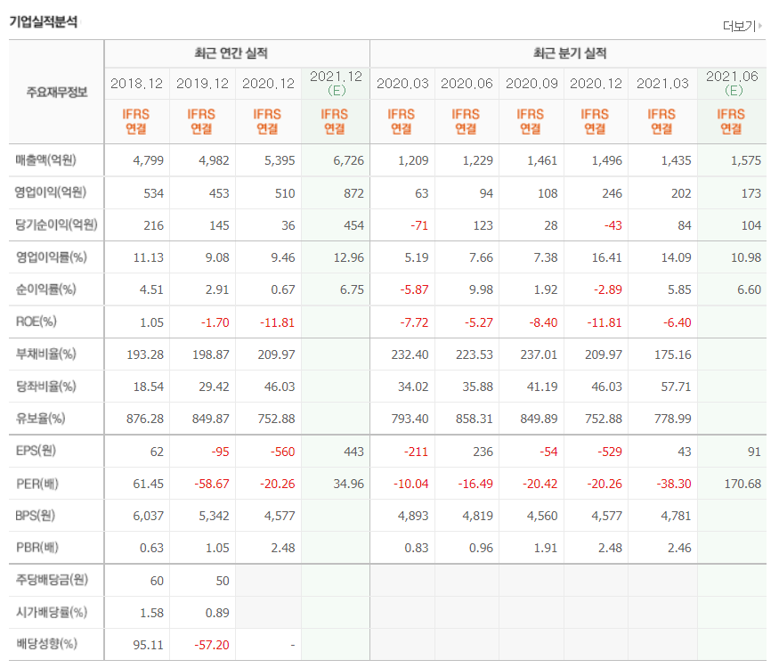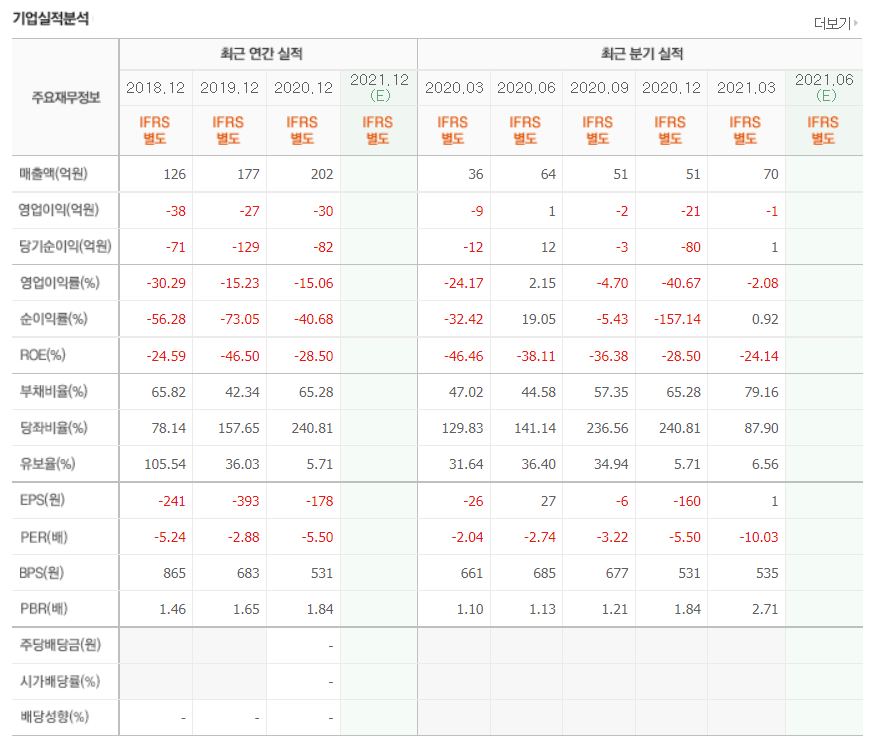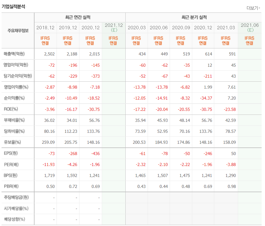 - 2020년 12월 전년동기 대비 별도기준 매출액은 14.3% 증가, 영업손실은 13% 증가, 당기순손실은 36.4% 감소.