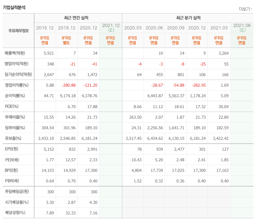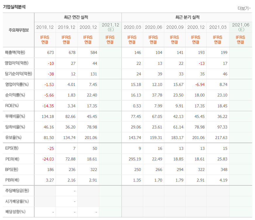 - 2020년 12월 전년동기 대비 연결기준 매출액은 0% 증가, 영업손실은 45.2% 증가, 당기순이익은 128.1% 증가.