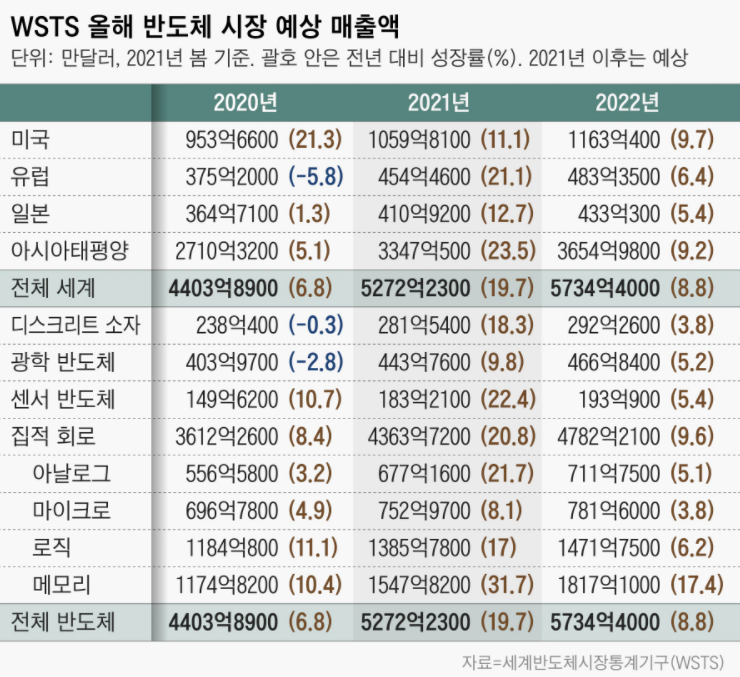 지난 9일 세계반도체시장통계기구(WSTS)가 최근 발간한 보고서에 따르면 올해 반도체 시장 예상 매출은 약587조4000억원에 달할 것으로 전망되었다. 이는 지난해 매출과 비교하여 19.7% 증가한 수치이다.