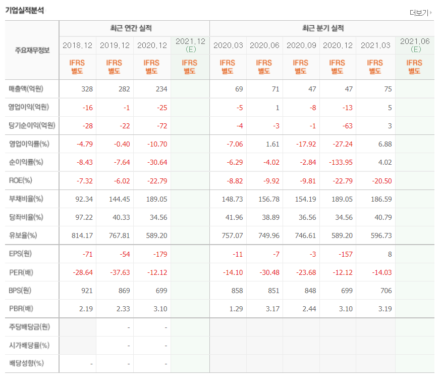 - 2020년 12월 전년동기 대비 별도기준 매출액은 17% 감소, 영업손실은 2115.9% 증가, 당기순손실은 232.9% 증가.