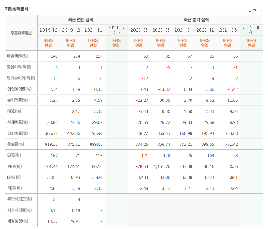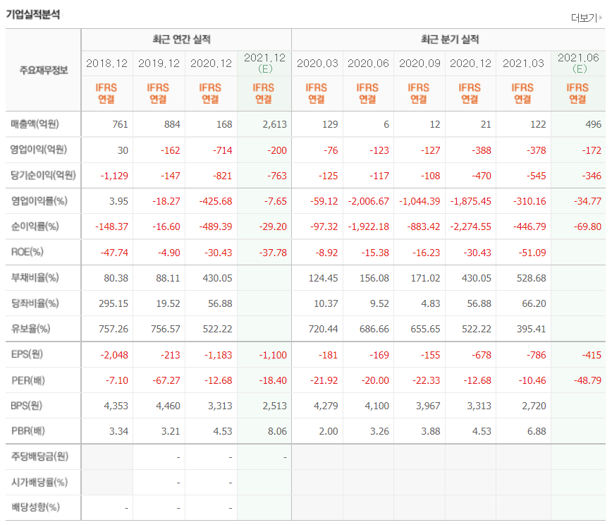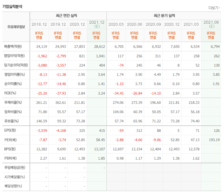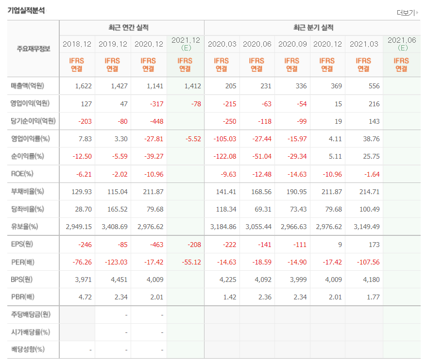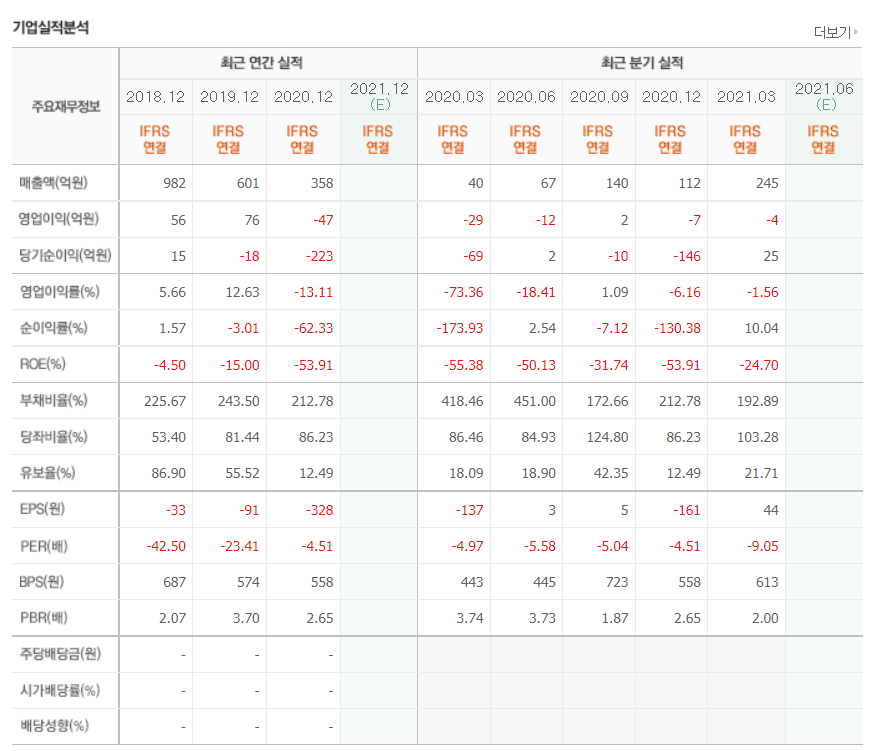 - 2020년 12월 전년동기 대비 연결기준 매출액은 81% 감소, 영업손실은 341.9% 증가, 당기순손실은 464.2% 증가.