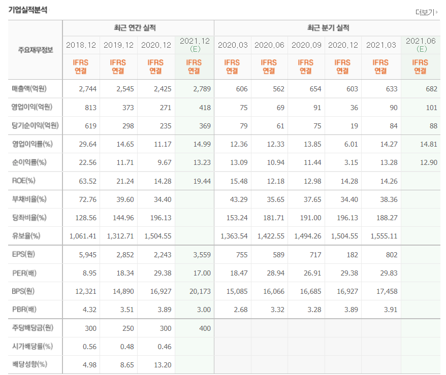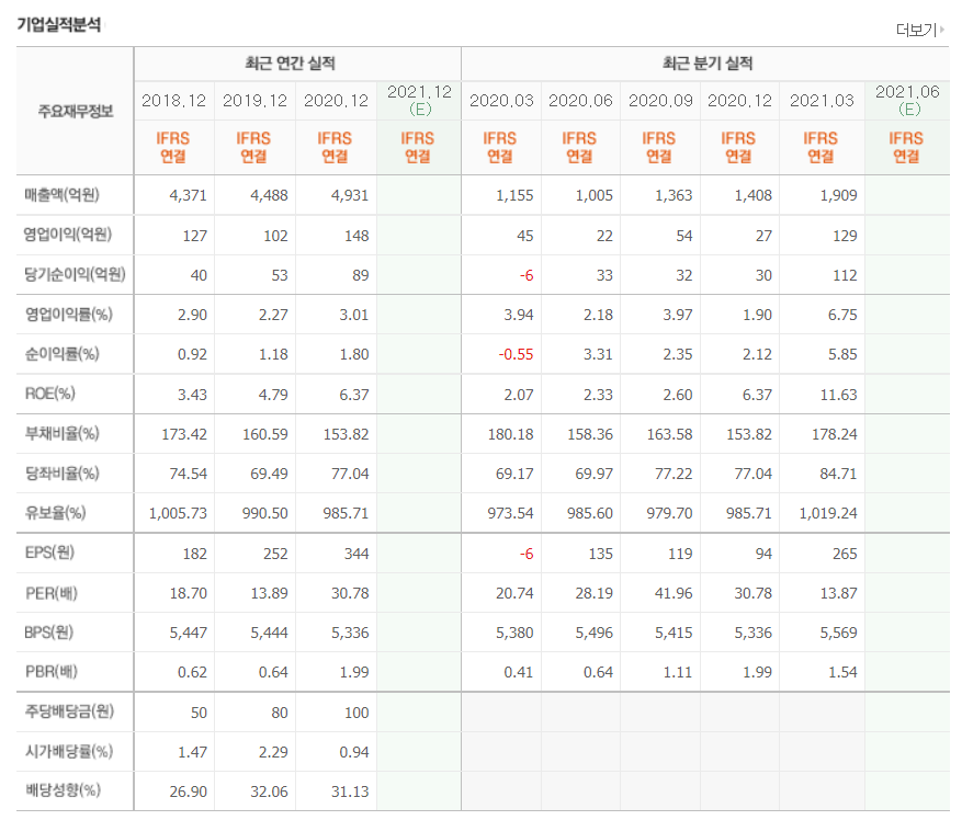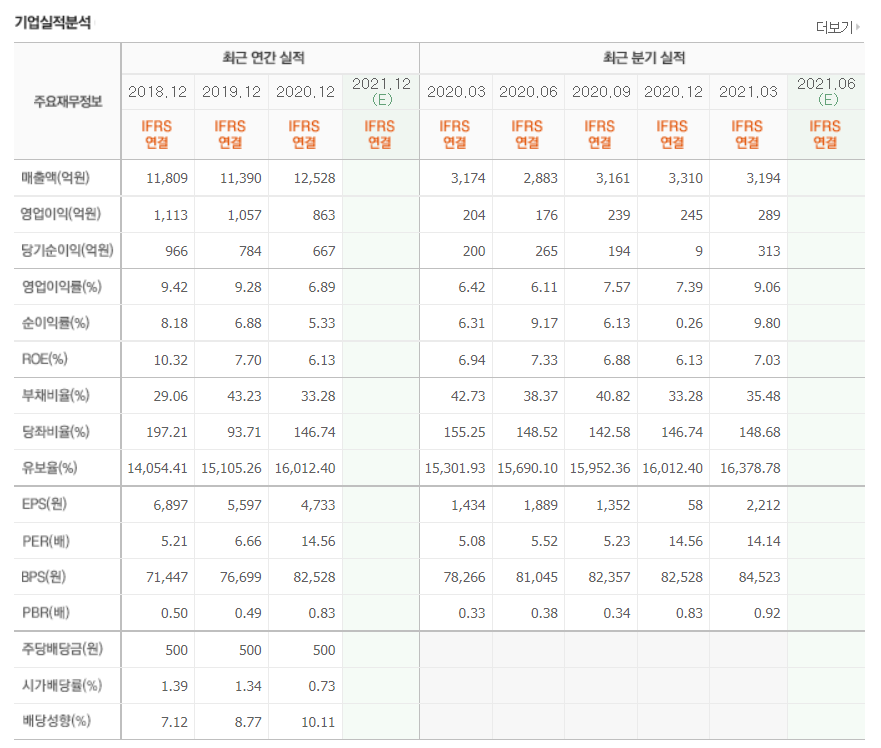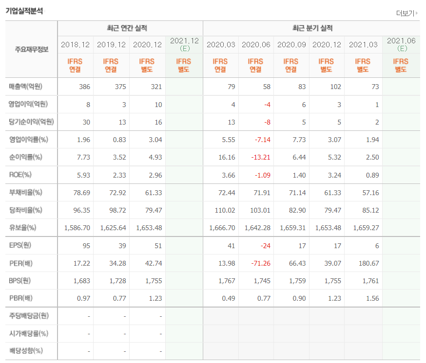 - 2020년 12월 전년동기 대비 별도기준 매출액은 14.4% 감소, 영업이익은 212.8% 증가, 당기순이익은 19.8% 증가.