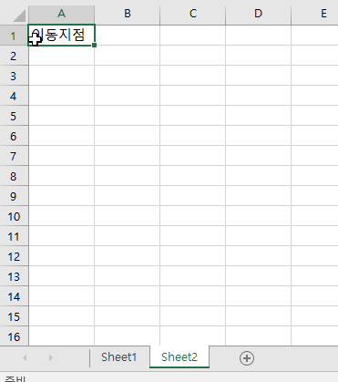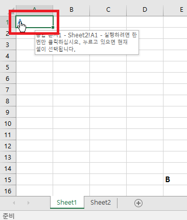 그러면 시트1에서 하이퍼링크를 설정하여, 시트2에 A1셀로 이동하도록 설정해보겠습니다.