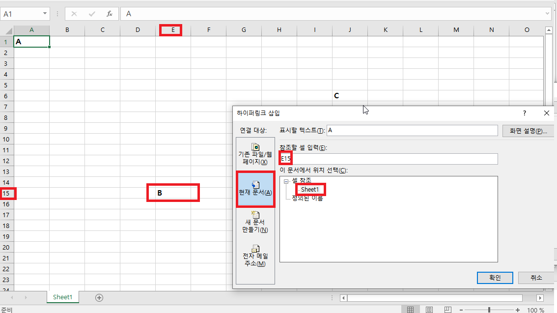 A값이 있는 A1셀에 하이퍼링크를 설정하여, B값이 있는 E15셀로 링크를 연결 해보도록 하겠습니다.
