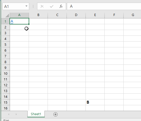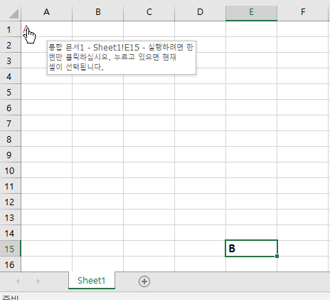 그러면 A가 파란글씨로 변하고 밑줄이 생깁니다. 클릭을 하면 커서가 B가 있는 E15셀로 이동되는걸 확인하실 수 있습니다.