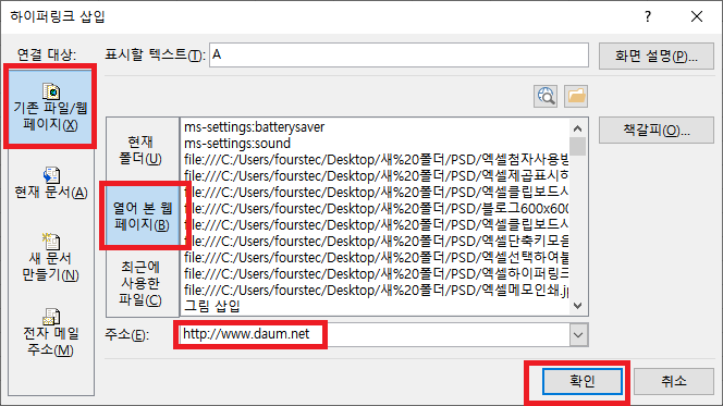 [기존 파일/웹페이지]-[열어 본 웹페이지]를 선택 후 주소란에 웹페이지 주소를 씁니다. 그리고 확인을 누릅니다.
