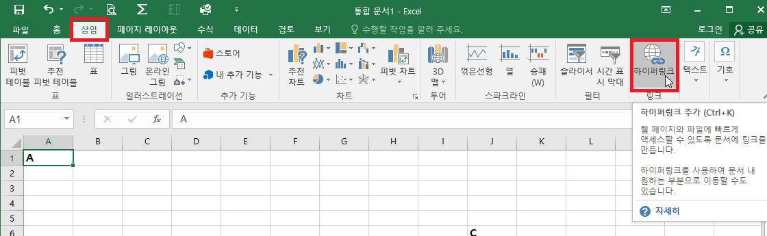 링크를 설정하려는 셀을 선택하고 [삽입] 탭 - [하이퍼링크]를 선택합니다.