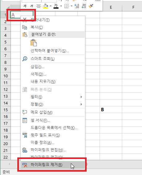 하이퍼링크를 제거해보겠습니다. 하이퍼링크가 설정된 셀을 선택한 뒤, 마우스 오른쪽 버튼을 클릭하여, [하이퍼링크 삭제]를 선택하여 줍니다.