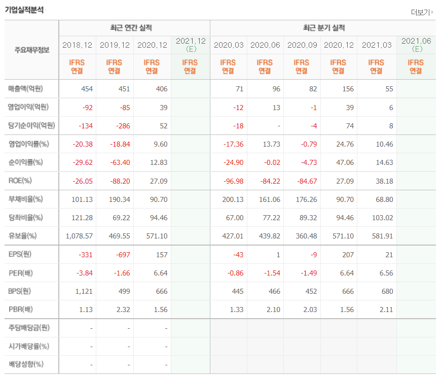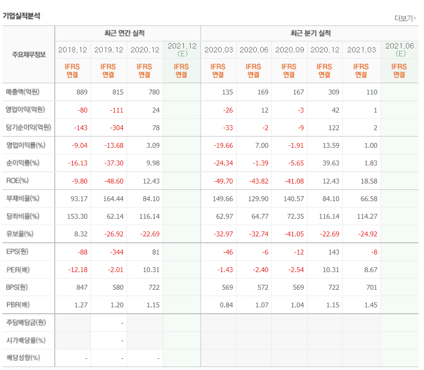 - 2021년 3월 전년동기 대비 연결기준 매출액은 18.7% 감소, 영업이익 흑자전환, 당기순손실은 82.3% 감소.