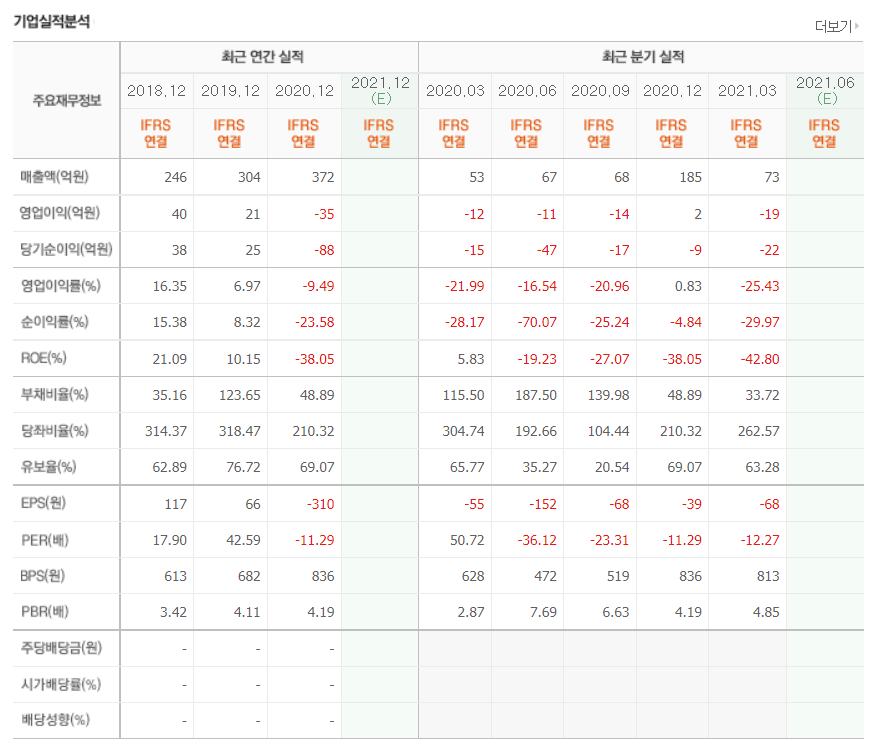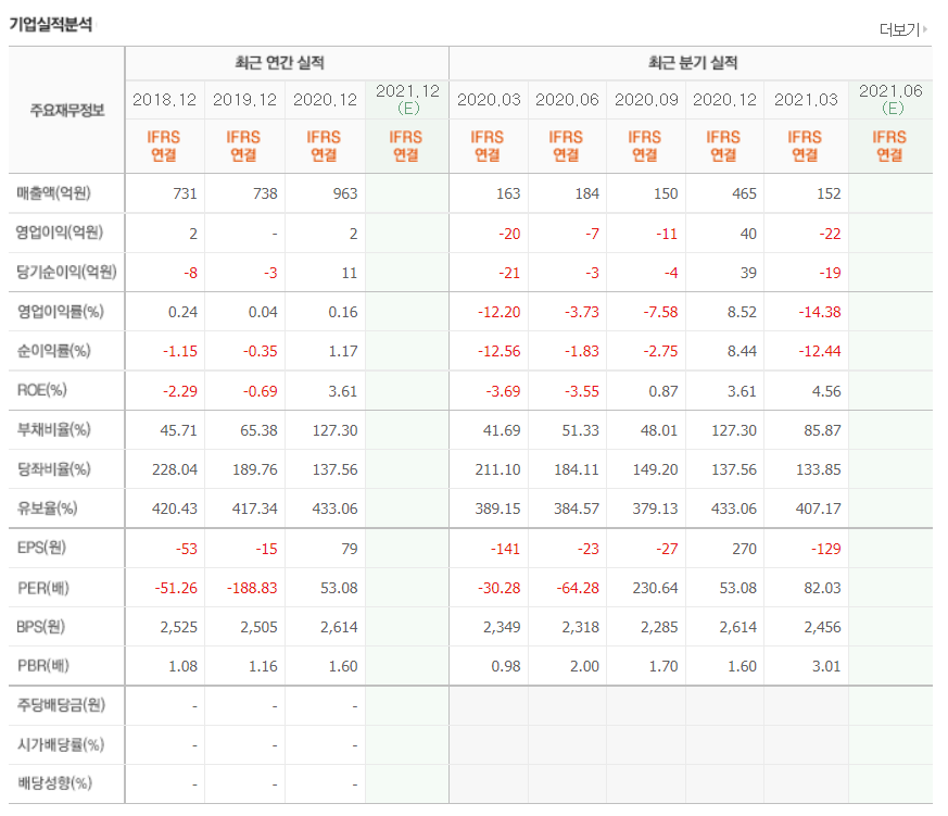 - 2021년 3월 전년동기 대비 연결기준 매출액은 7% 감소, 영업손실은 9.6% 증가, 당기순손실은 8.2% 감소.