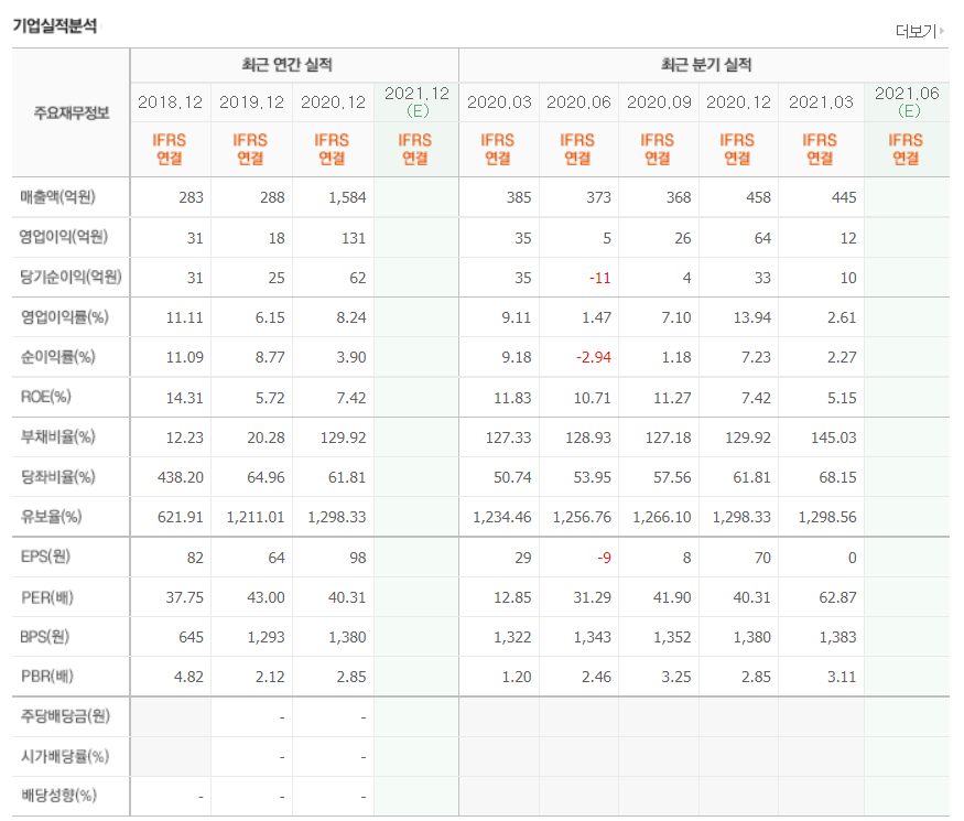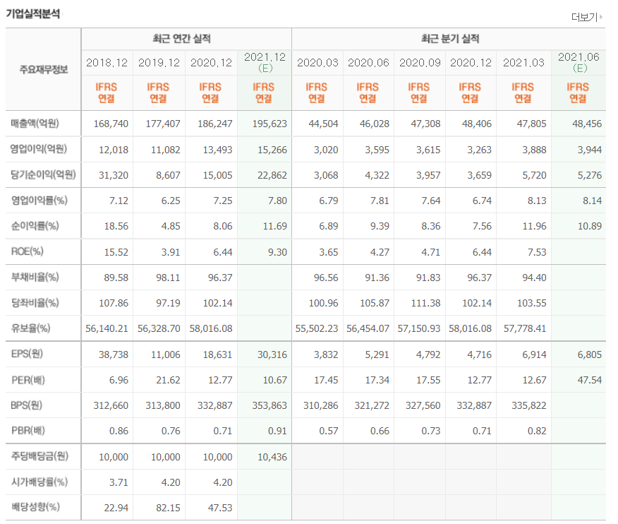 - 2021년 3월 전년동기 대비 연결기준 매출액은 22% 증가, 영업이익은 29.3% 감소, 당기순이익은 1,682.1% 증가.
